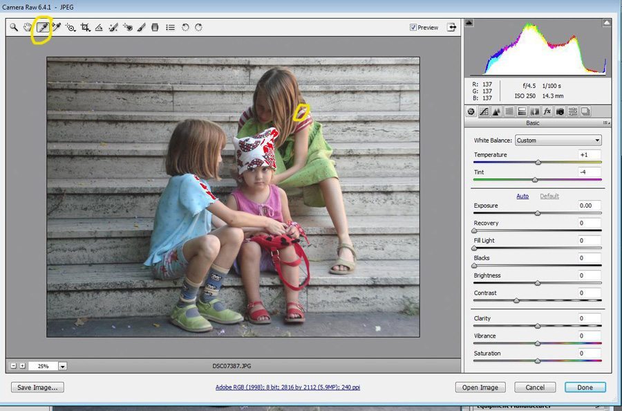 In this next screenshot, I’ve used the white balance tool (circled) to pick a point in the photo that is most neutral/near a 12% gray. Clicking here changed the temperature of the light. You can see the subtle but real difference after this change.